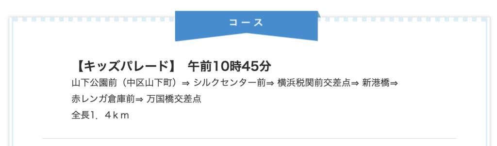 キッズパレードは山下公園から赤レンガ倉庫までです。
